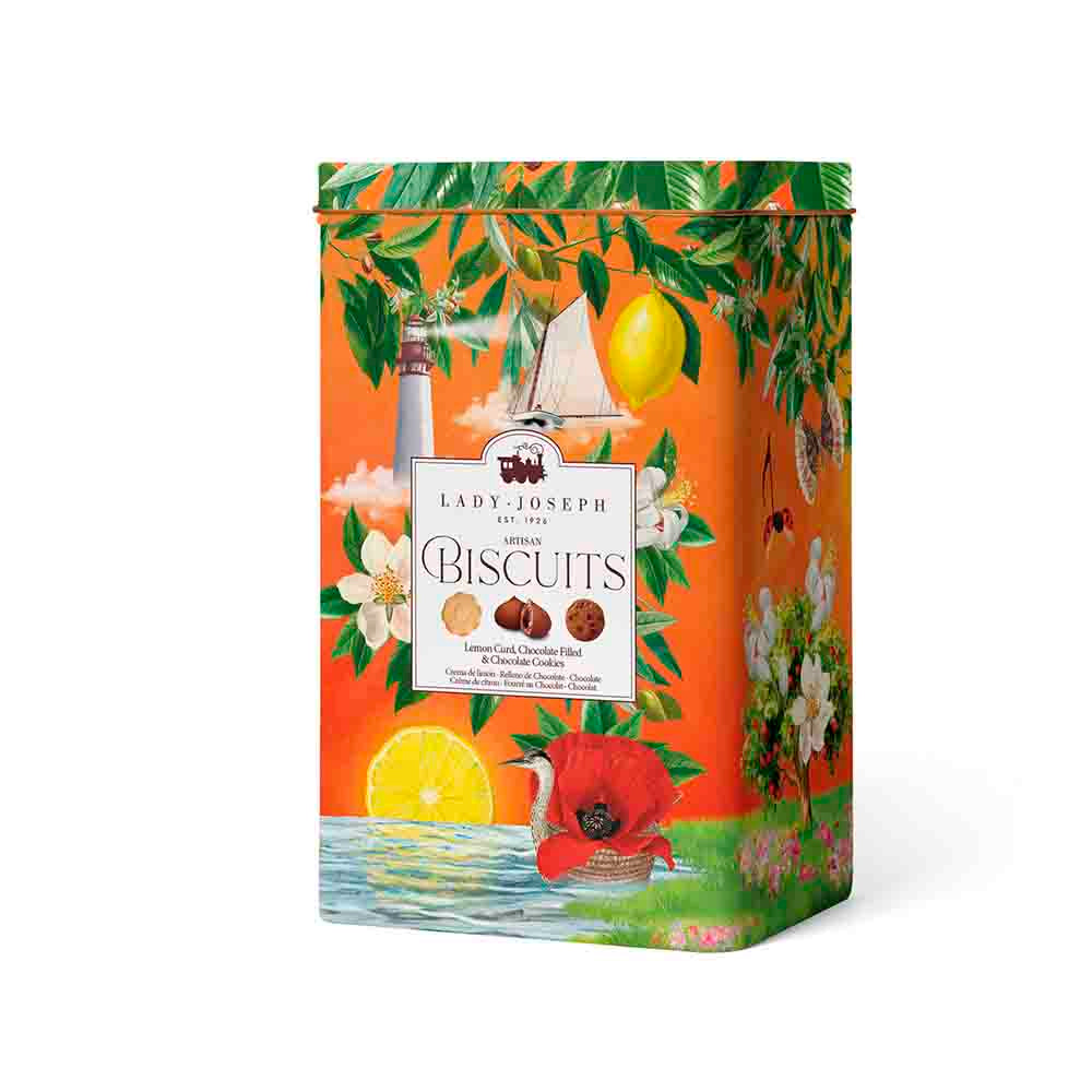 Elegante caja variada en lata metálica. Un surtido con tres variedades diferentes y envasadas de forma individual para así, mantener toda su frescura. Galleta crema limón, galleta de chocolate relleno y cookies de chocolate negro y naranja. Elaboradas con ingredientes naturales, artesanas y horneadas a baja temperatura para conservar todo su aroma y sabor.